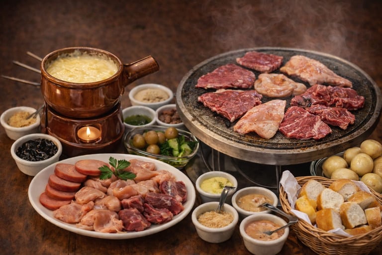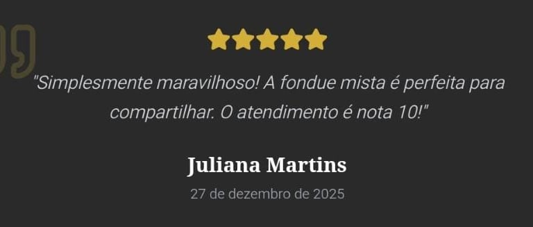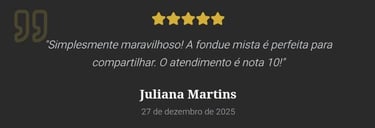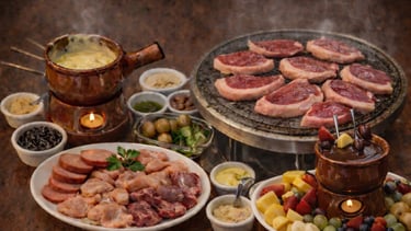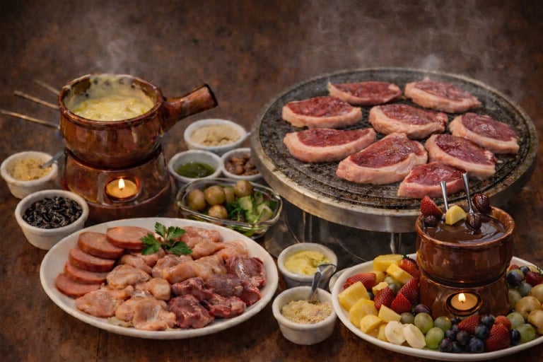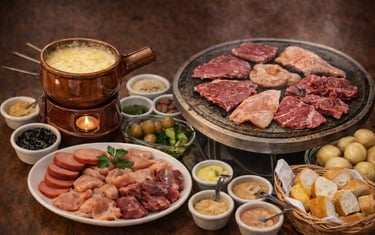 Uma combinação encantadora de sabores: fondue de queijo, carnes selecionadas e um toque doce com chocolate ao leite e acompanhamentos clássicos.