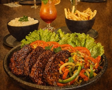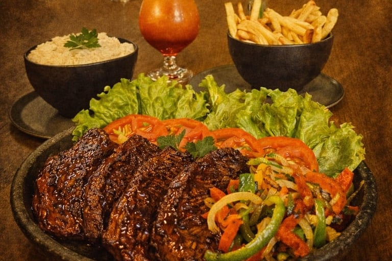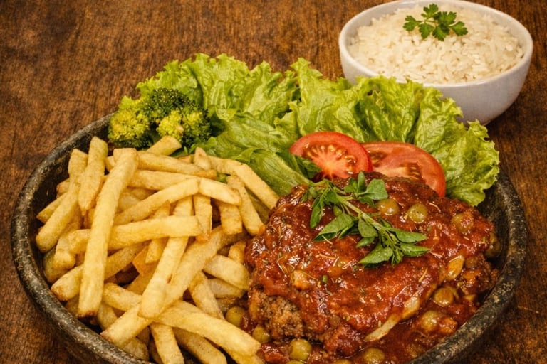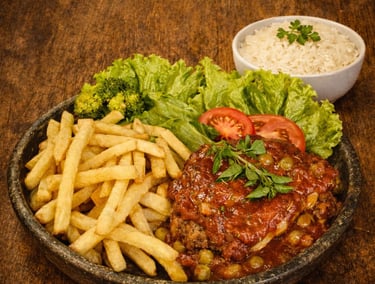 Filé mignon, arroz, fritas e salada