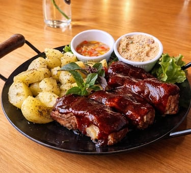 Costela suína, glaceadas no barbecue, batatas rústicas e farofa
